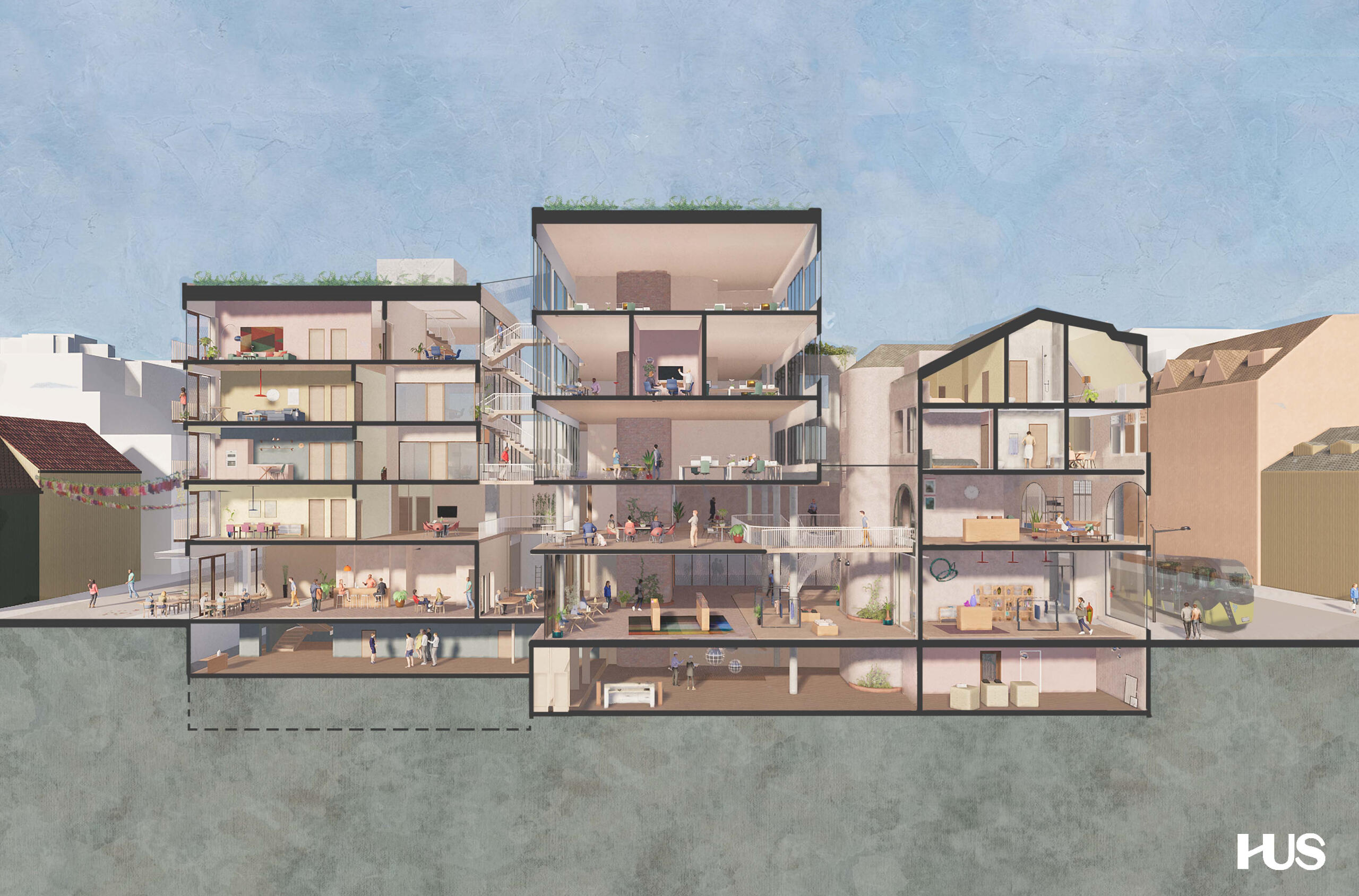 Konkurranse fra min periode som innleid hos HUS arkitekter.I konkurransen inngikk flere eksisterende bygginger i et gjennomgående kvartal i Midtbyen i Trondheim. Bygningene omfatter både bygg med verneverdier, en gjennoppføring av et revet trebygg og nybygg i gårdsrom.